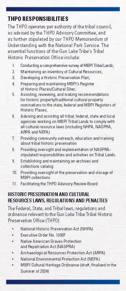 The Tribal Historic Preservation Office operates per the authority of the Tribal Council, as advised by the Advisory Review Board and as further stipulated by our THPO Memorandum of Understanding with the National Park Service. In 2018, the Tribe applied and was approved by the National Park Service to operate the THPO responsibility on Tribal Lands. Previously, the State Historic Preservation Office (SHPO) operated these functions. Taking on these responsibilities is an active expression of MBPI’s sovereignty to oversee and protect their lands, culture, and history.